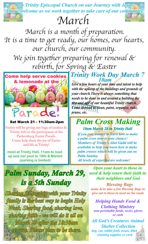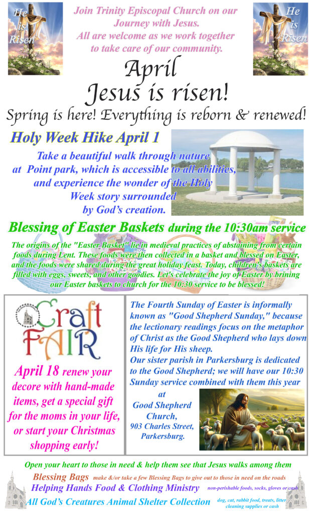 TRINITY EPISCOPAL CHURCH is located in the heart of downtown Parkersburg, WV. The parish assists with many forms of community assistance; from our own Monday lunch program and in partnership with Community Resources and Thrive we assist with food and utility assistance for families and individuals in need. Additionally, the church supports the mission and ministry of various local, national and international charitable organizations. Stop by and say “Hello”.